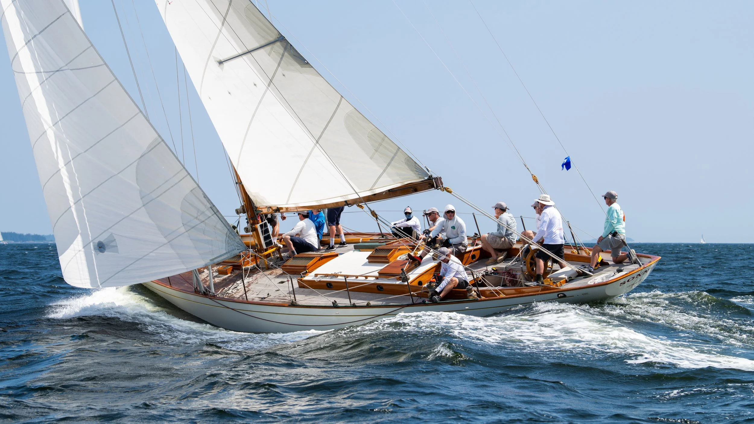EVA MAY came to Bristol for a complete restoration with a focus on remaining faithful to the Star Class. Our crew replaced her entire centerline, including new keel, keelson, and floors. The original iron ballast was reused, but carefully isolated and attached with new silicon bronze keel bolts. All new deck frames served as a stable structure to support a new laid deck of Alaskan Yellow Pine. The final piece of the puzzle was to re-install the hardware in the original layout and deliver freshly painted and ready again for one-design competition.